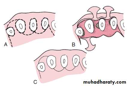 In current reconstructive therapy, bone grafts, membranes, or a combination of these, with or without other agents, are used for a successful outcome. The flap design should therefore be set up so that the maximum amount of gingival tissue and papilla are retained to cover the material(s) placed in the pocket.Two flap designs are available for reconstructive surgery: the