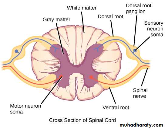 The spinal cord plays a key role in integration of multiple peripheral and central inputs via the system of neurons in the gray matter. On cross-section, the gray matter in the spinal cord includes the dorsal, ventral, and an intermediolateral horns or columns.White matter