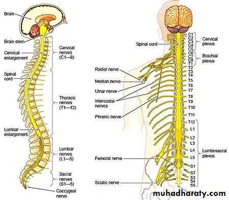 The spinal cord is a cylindrical structure of nervous tissue composed of white and gray matter, is uniformly organized and is divided into four regions: cervical (C), thoracic (T), lumbar (L) and sacral (S), each of which is comprised of several segments. The spinal nerve contains motor and sensory nerve fibers to and from all parts of the body. Each spinal cord segment innervates a dermatome.