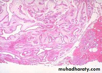 Papillary cystadenoma as above but with papillary (warty or finger-like projections)