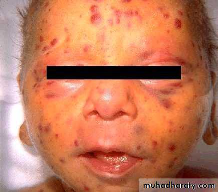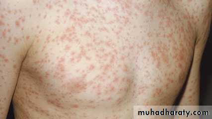 • A- RUBELLA: German measles• It is a milder, shorter disease than measles. After an incubation period of 14-21 days, a brief prodromal period with fever and malaise is followed by a maculopapular rash, which starts on the face and progresses downward to involve extremities. Posterior auricular lymphadenopathy is characteristic. The rash typically lasts 3 days.