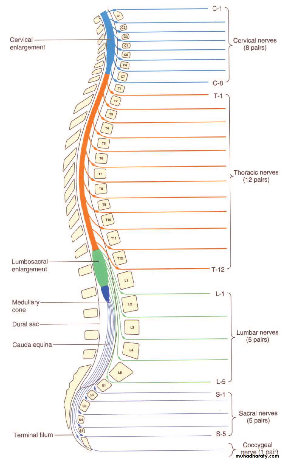 Sagital gross anatomy1-The spinal cord has 31 segments: 8 cervical, 12 thoracic , 5 lumbar, 5 sacral, 1 coccygeal.