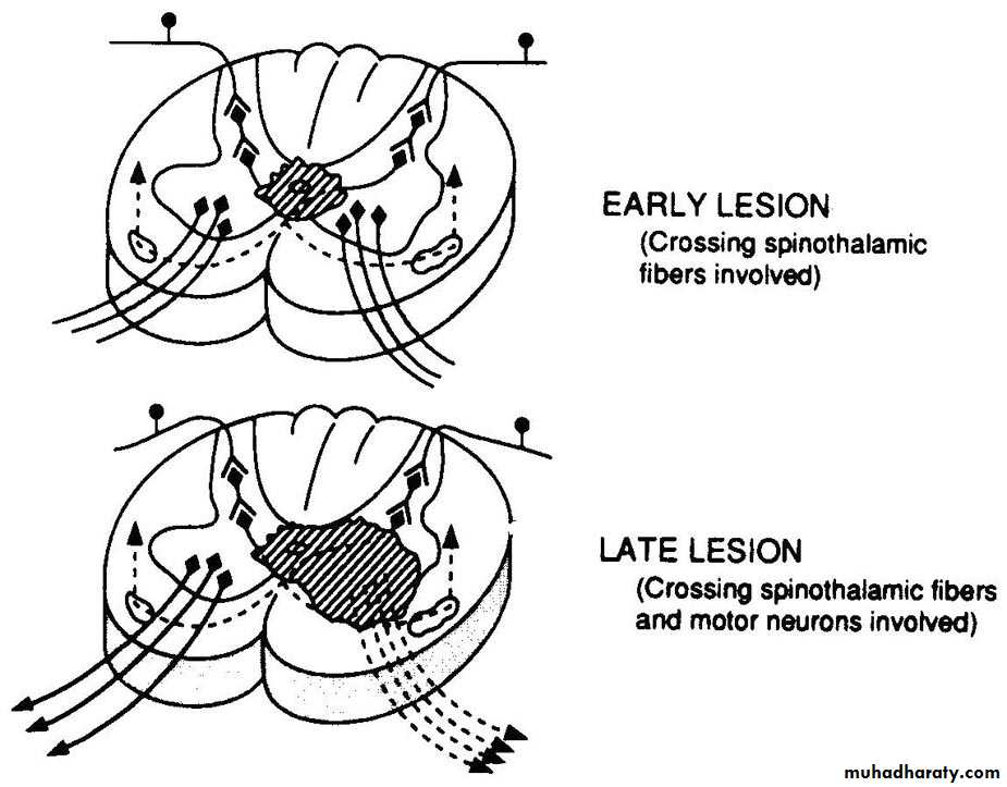 A- “dissociated” selective sensory loss of pain and temperature (capelike distribution if it occurs in cervical spinal cord).B- With further expansion, lateral corticospinal tracts may be involved, producing upper motor neuron signs below level of the lesion.