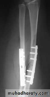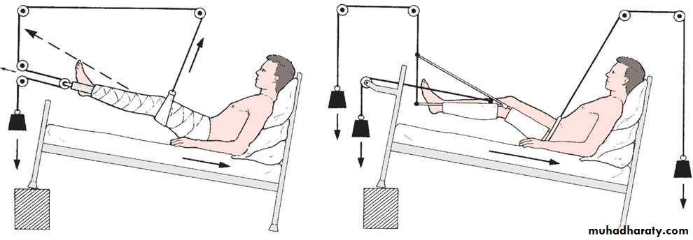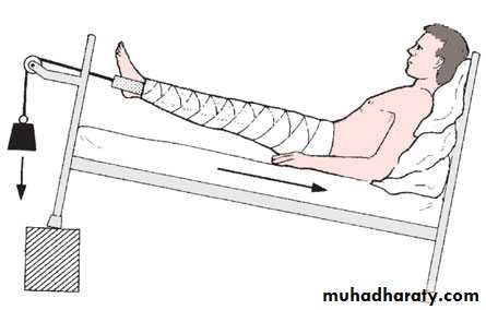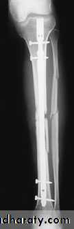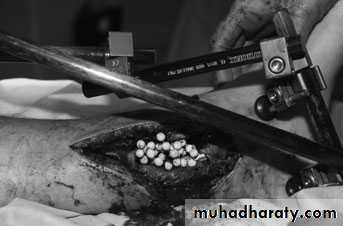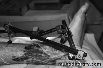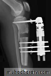 5. External fixation: its usually used in compound fr it means that we use a metal pins that pass through the skin from outside proximal and distal to the fr and after proper reduction the pins are joined together outside the skin by special long bars.The indications of external fixation:
