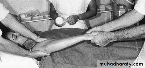by manipulation of the fr under anesthesia or sometimes analgesia; this Aincludes:Traction of the fragments (always use a counter traction of the assistant) to disimpact the fr.