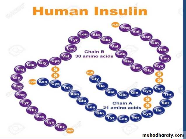 Insulin is composed of two peptide chains referred to as the A chain and B chain. A and B chains are linked together by two disulfide bonds, and an additional disulfide is formed within the A chain. In most species, the A chain consists of 21 amino acids and the B chain of 30 amino acids.• Type 1 diabetes