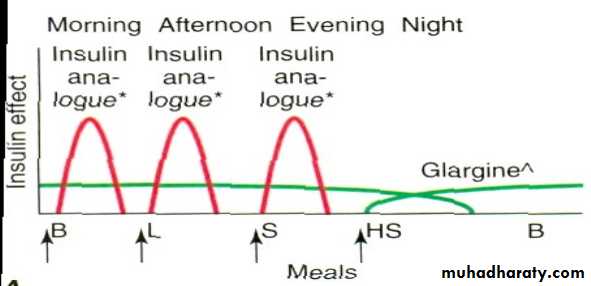• In basal bolus regimen: ½ basal at bed time and ½ bolus in 3 divided doses. Dosage is individualized and titrated soon