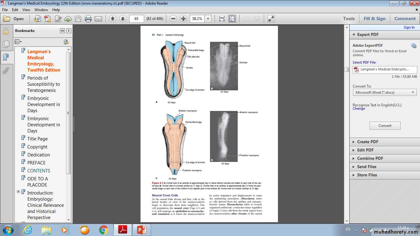 • Neurulation is the process whereby the neural plate forms the neural tube. By the end of the third week, the lateral edges of the neural plate become elevated to form neural folds, and the depressed mid region forms the neural groove. Gradually, the neural folds approach each other in the midline, where they fuse . Fusion begins in the cervical region (fifth somite) and proceeds cranially and caudally . As a result, the neural tube is formed. Until fusion is complete the cephalic and caudal ends of the neural tube communicate with the amniotic cavity by way of the anterior (cranial) and posterior (caudal) neuropores, respectively.• Closure of the cranial neuropore occurs at approximately day 25 (18- to 20-somite stage). whereas the posterior neuropore closes at day 28 (25-somite stage).
