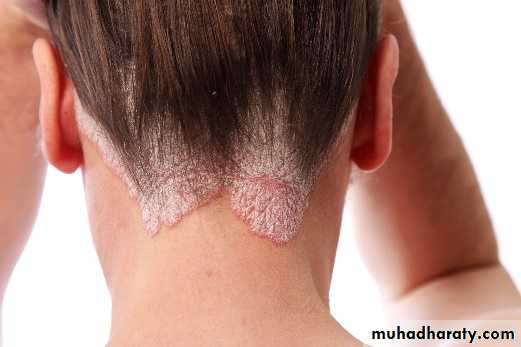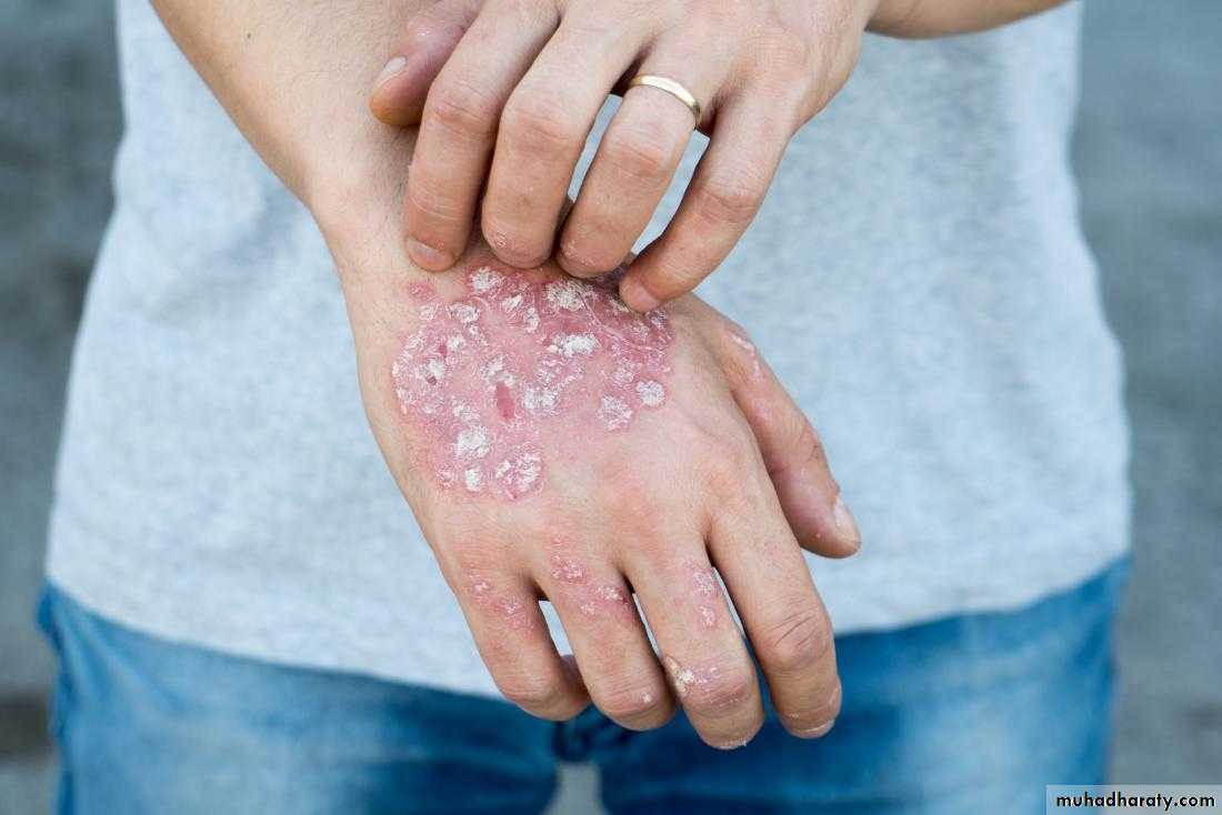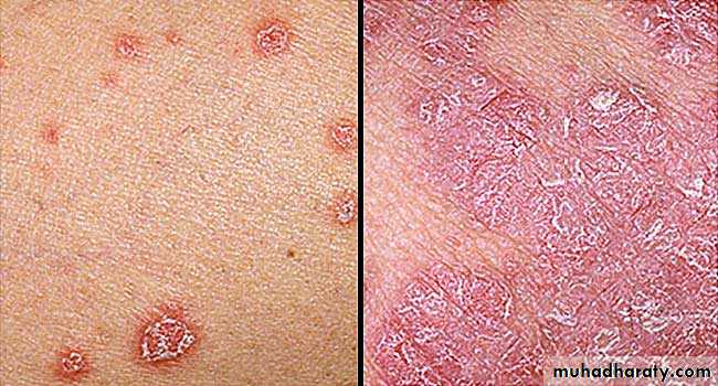 Psoriatic arthritis: It resembles the rheumatoid type, but it is associated with psoriasis, a dermatologic disease. Radiographic findings reveal osteoarthritis changes with erosion, osteoporosis and narrowing of articular space. This polyarthritis is asymmetric. –ve seriological test for Rh. fever.