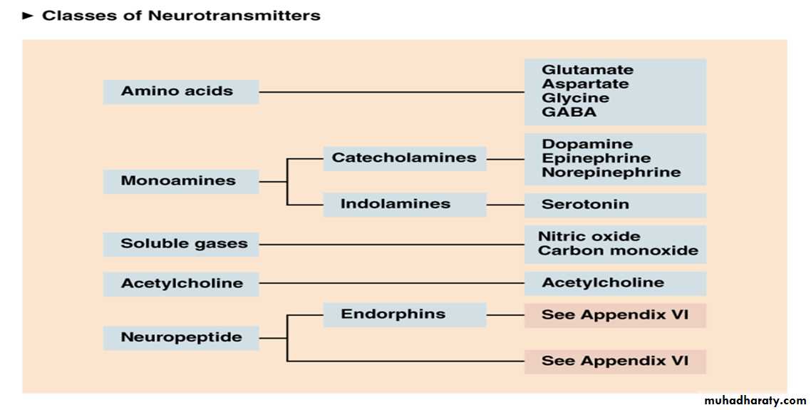 • Excitatory neurotransmitters include ACh, norepinephrine, epinephrine, dopamine, glutamate, and serotonin.