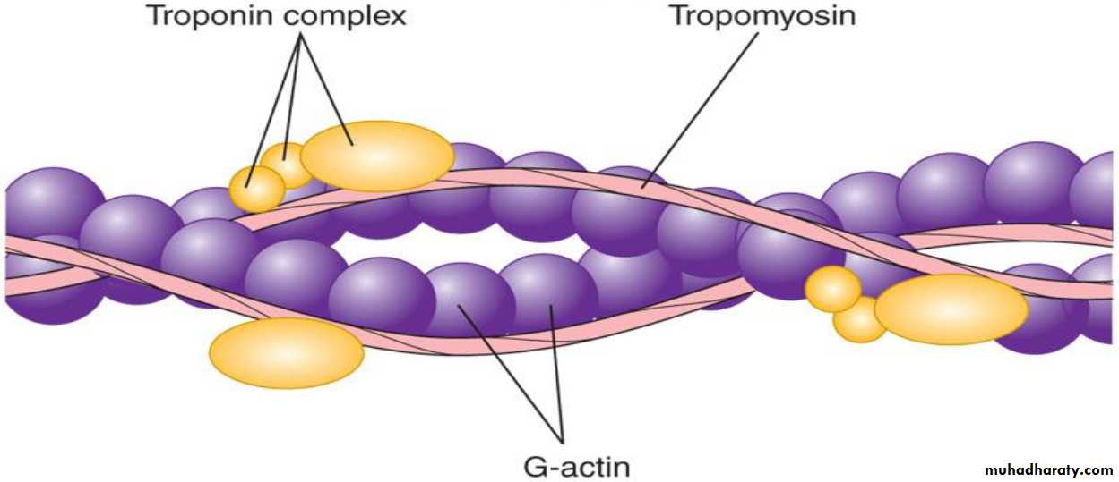 •The filament tropomyosin lies in groove between double row of G-actins of thin myofilament •Troponincomplex is attached to tropomyosin at intervals.