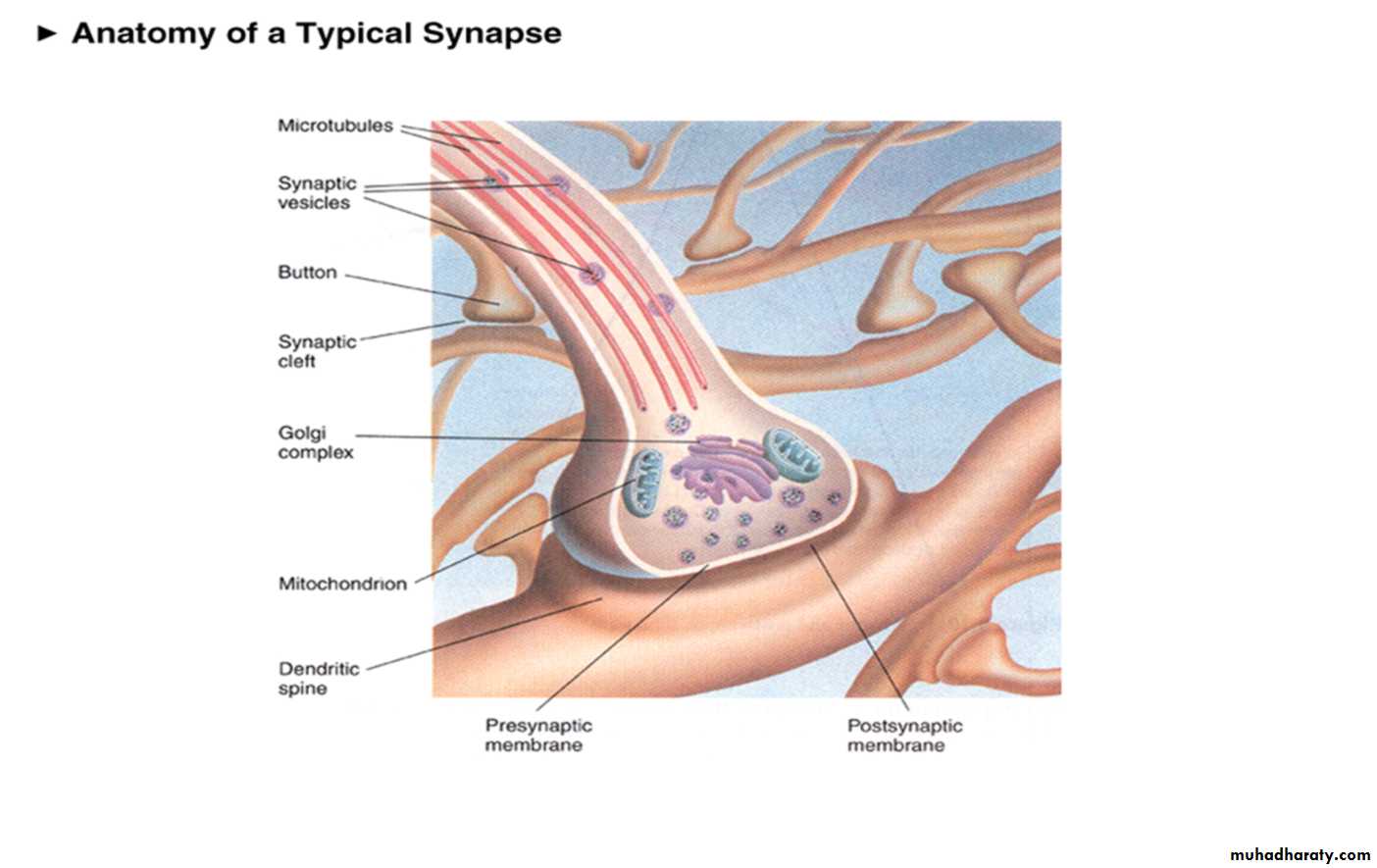 Synapses – specialized junction where an axon terminal contacts another neuron or cell type , by which excitable cells communicate with one another where information is transmitted from between them. As Nerve to nerve synapse, nerve to muscle - neuromuscular junction, and nerve to gland - neuroglandular junction