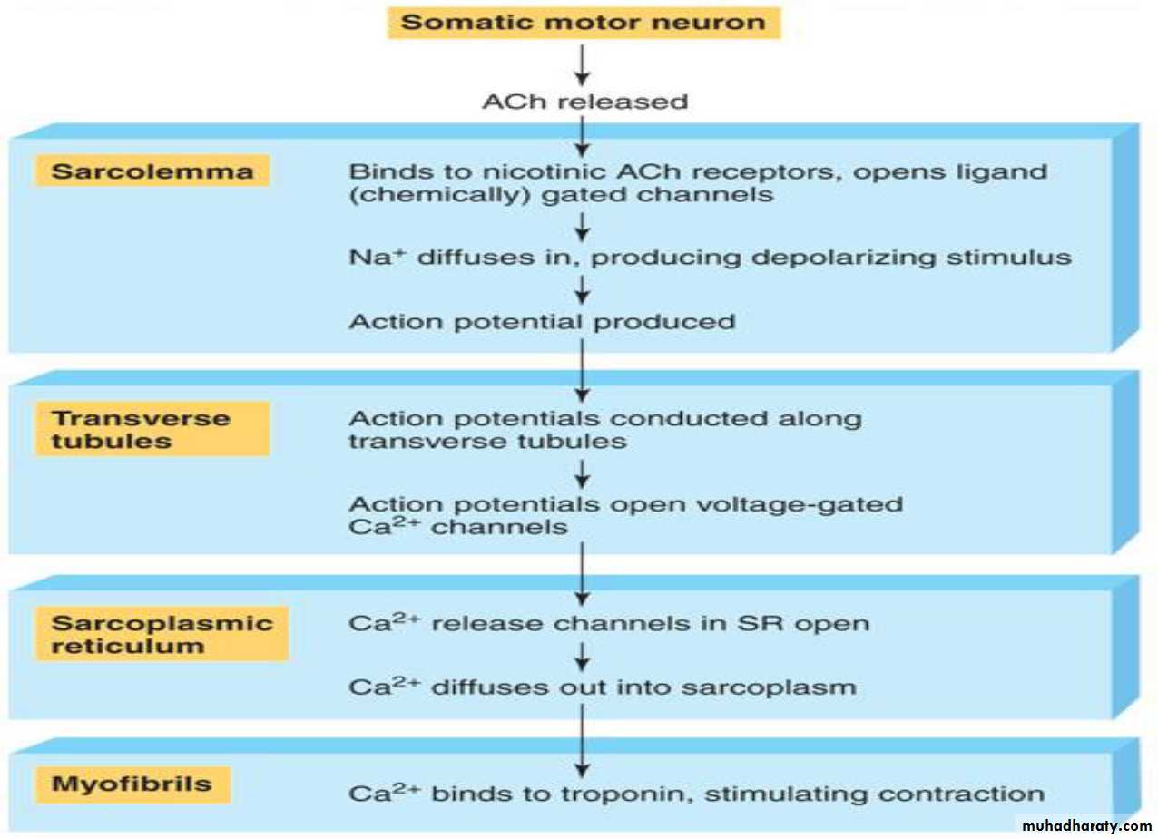 3. The action potential travels along the muscle fiber membrane, causing the sarcoplasmic reticulum to release calcium ions into the myofibrils that have been stored in the sarcoplasmic reticulum