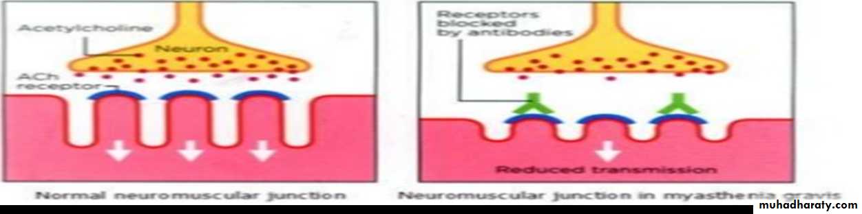 • Myasthenia gravis is an autoimmune disease(Antibodies which destroy the nicotinic Ach in NMJ , Antibodies 90% serum of patients) in which the patients have developed immunity against their own acetylcholine receptors the patient dies of paralysis, paralysis of the respiratory muscles .