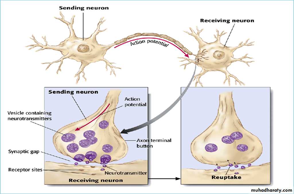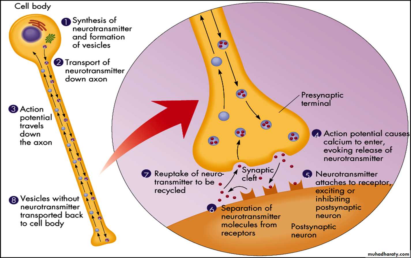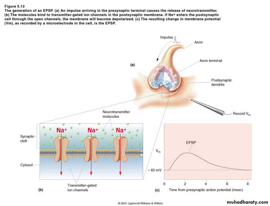An action potential in the presynaptic cell causes Ca2+ channels to open. An influx of Ca2+ into the presynaptic terminal causes the neurotransmitter, which is stored in synaptic vesicles, to be released by exocytosis. The neurotransmitter diffuses across the synaptic cleft, binds to receptors on the postsynaptic membrane, and produces a change in membrane potential on the postsynaptic cell. The change in membrane potential on the postsynaptic cell membrane can be either excitatory or inhibitory, depending on the nature of the neurotransmitter released from the presynaptic nerve terminal. Opening of ion channels often produces either depolarization the inside of the post synaptic membrane called( excitatory post synaptic potential)(EPSP). In other cases, causing hyper polarization inside the post synaptic membrane( more negative) called inhibitory post synaptic potential(IPSP).