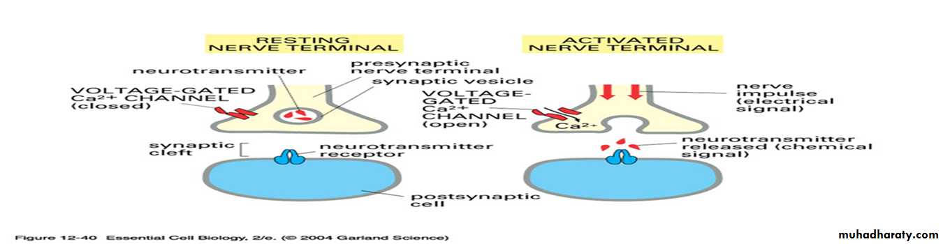 junction، vesicles containing acetylcholine are released into the synaptic cleft. This occurs because When the action potential spreads over the nerve terminal the calcium-gated channels open