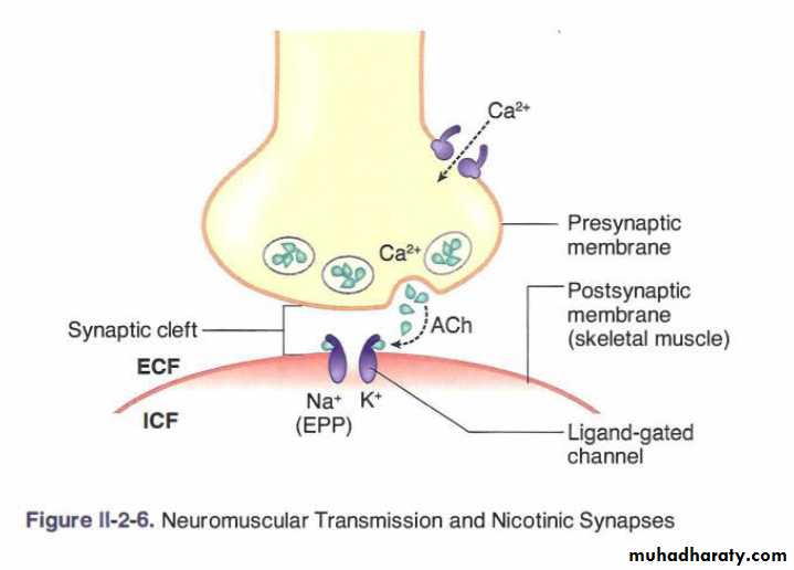 •Release of ACh at NMJ causes large depolarizing motor end-plate potentials and APs by opening sodium channels
