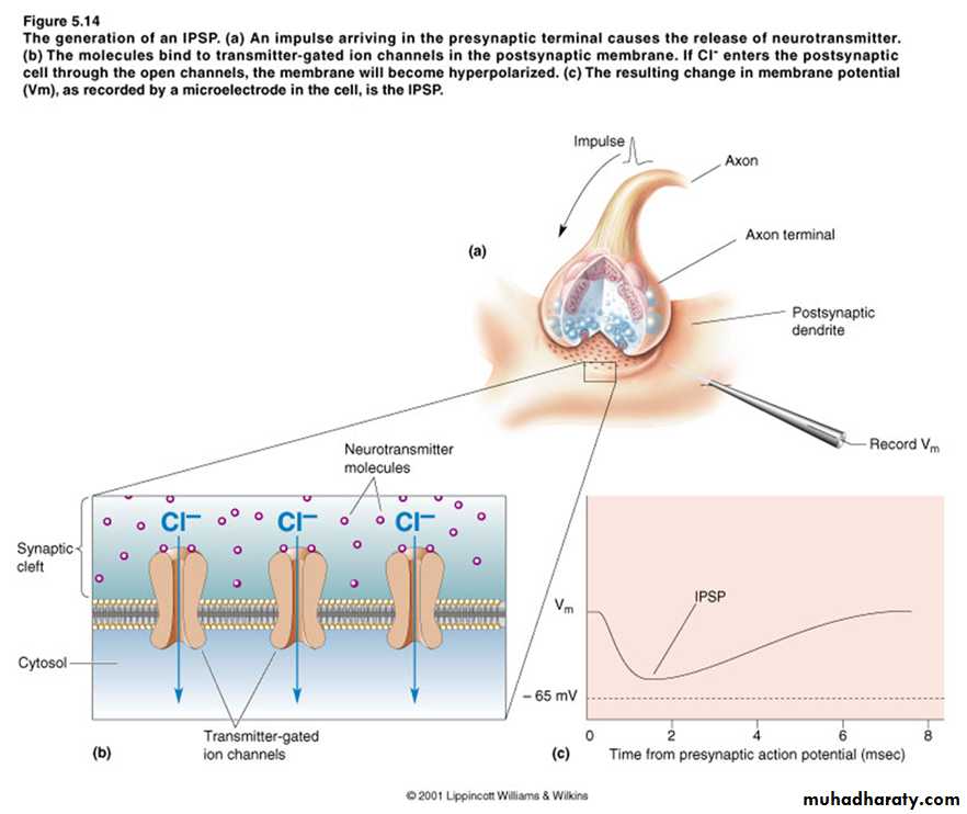 Inhibitory Postsynaptic Potentials (IPSPs) are synaptic inputs that hyperpolarize the postsynaptic cell, taking the membrane potential away from threshold and farther from firing an action potential. IPSPs are produced by opening Cl− channels. The membrane potential is driven toward the Cl− equilibrium potential (approximately −90 mV), which is a hyperpolarized state.