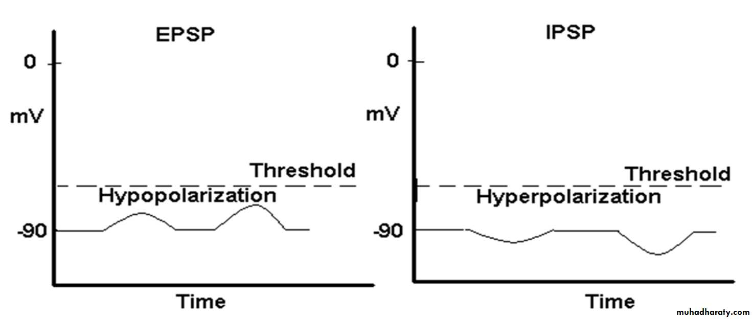 • The inputs being either excitatory or inhibitory , if the sum of the inputs is sufficient to bring the postsynaptic cell to threshold, it will then fire an action potential.
