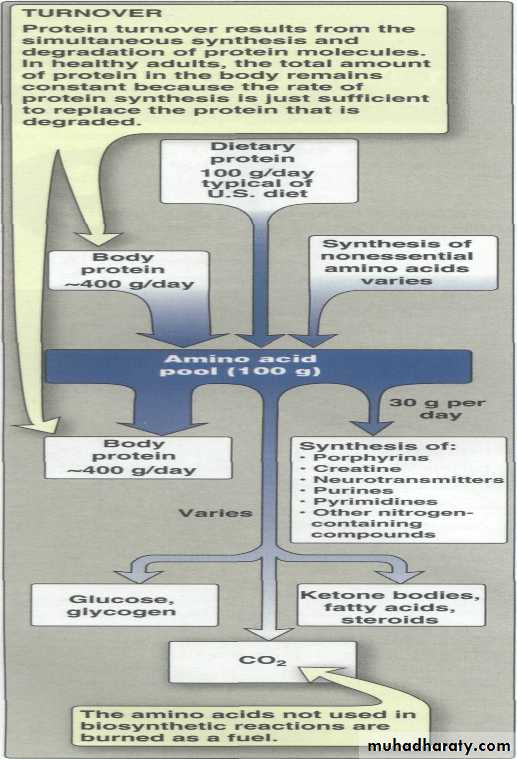 free a.a s are derived from dietary proteins or from degradation of endogenous proteins are metabolized in identical ways .Their alpha amino nitrogen is first removed either by transamination or by oxidative & nonoxidative deamination . The resulting carbon skeleton is then degraded .