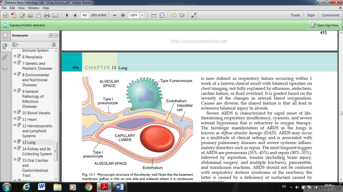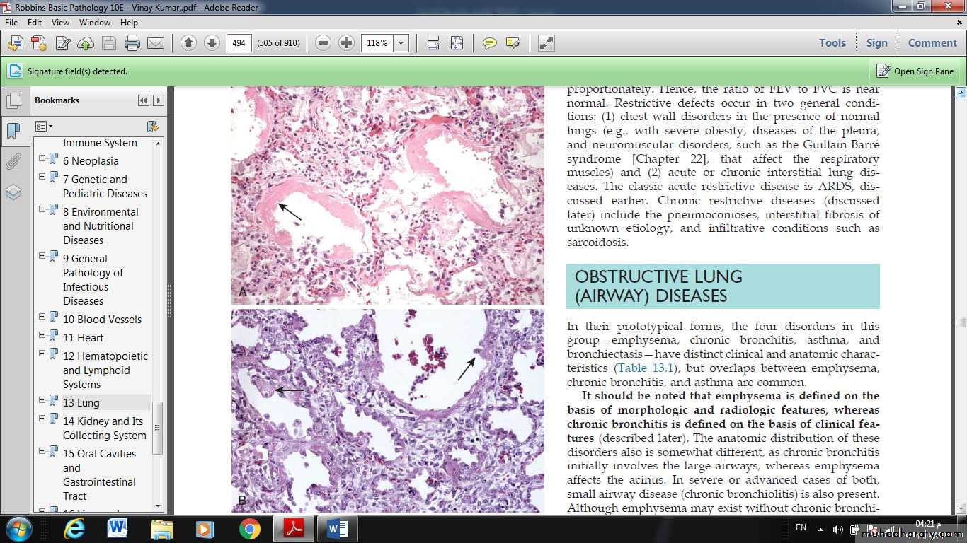 Fig. Acute lung injury and acute respiratory distress syndrome. (A) Diffuse alveolar damage in the acute phase. Some alveoli are collapsed, while others are distended; many are lined by bright pink hyaline membranes (arrow). (B) The healing stage is marked by resorption of hyaline membranes and thickening of alveolar septa by inflammatory cells, fibroblasts, and collagen. Numerous reactive type II pneumocytes also are seen at this stage (arrows), associated with regeneration and repair.