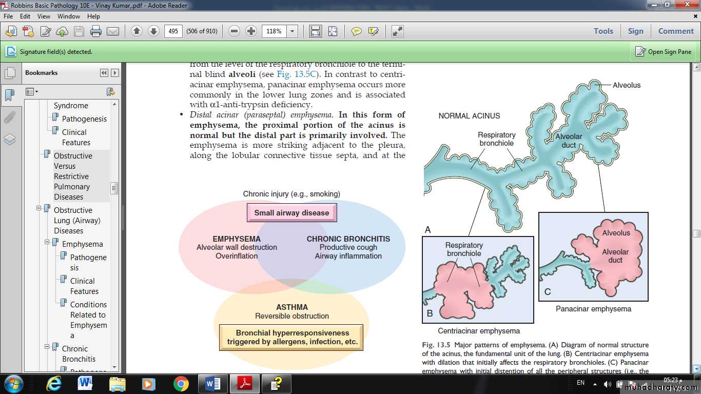 Fig. Major patterns of emphysema. (A) Diagram of normal structure of the acinus, the fundamental unit of the lung. (B) Centriacinar emphysema with dilation that initially affects the respiratory bronchioles. (C) Panacinar emphysema with initial distention of all the peripheral structures (i.e., the alveolus and alveolar duct); the disease later extends to affect the respiratory bronchioles.