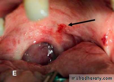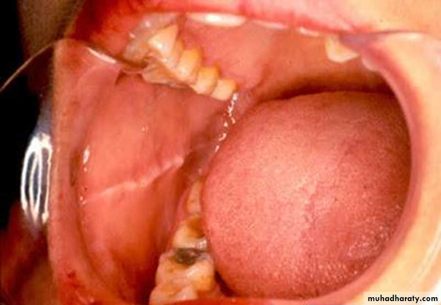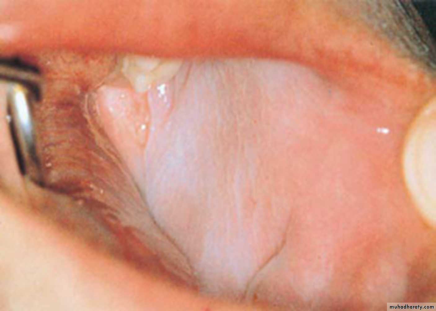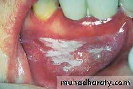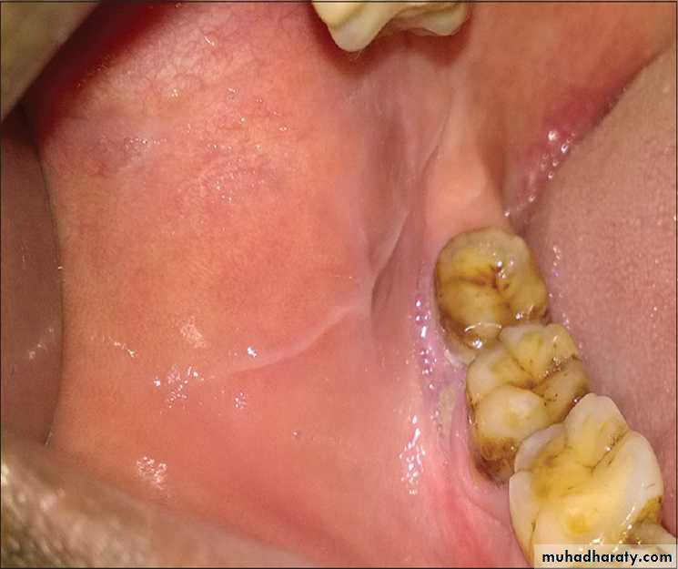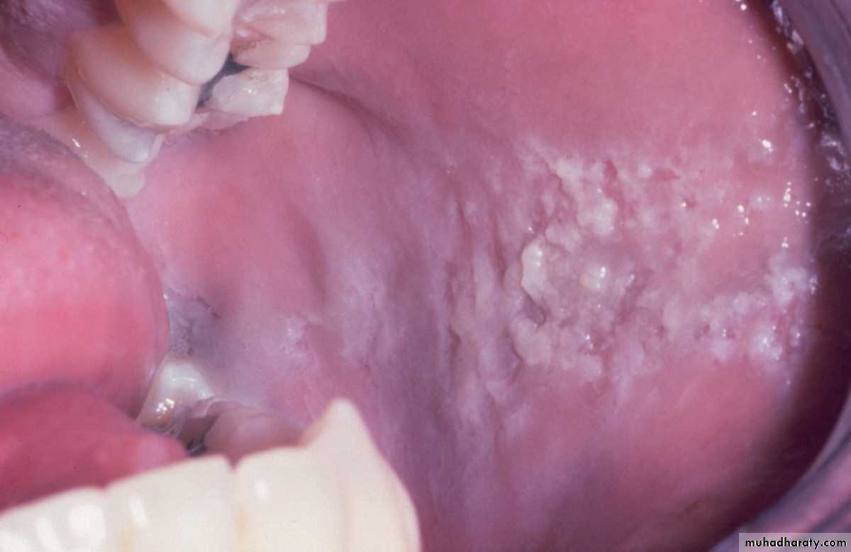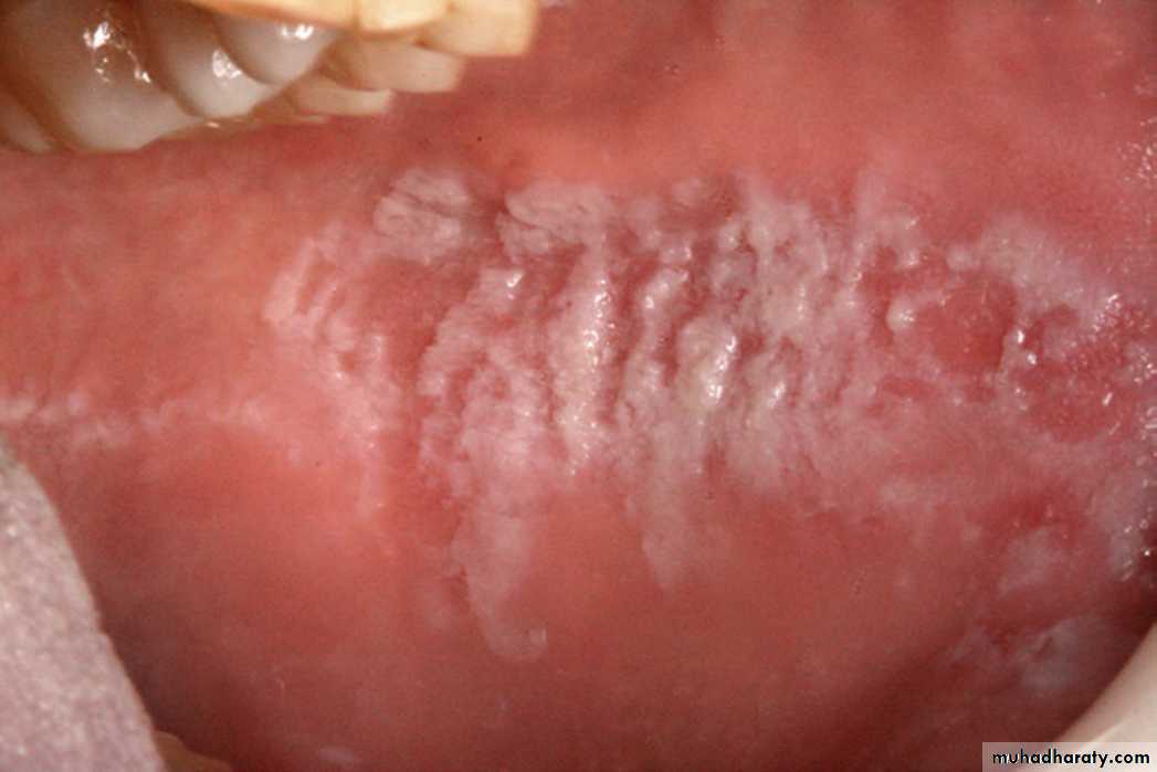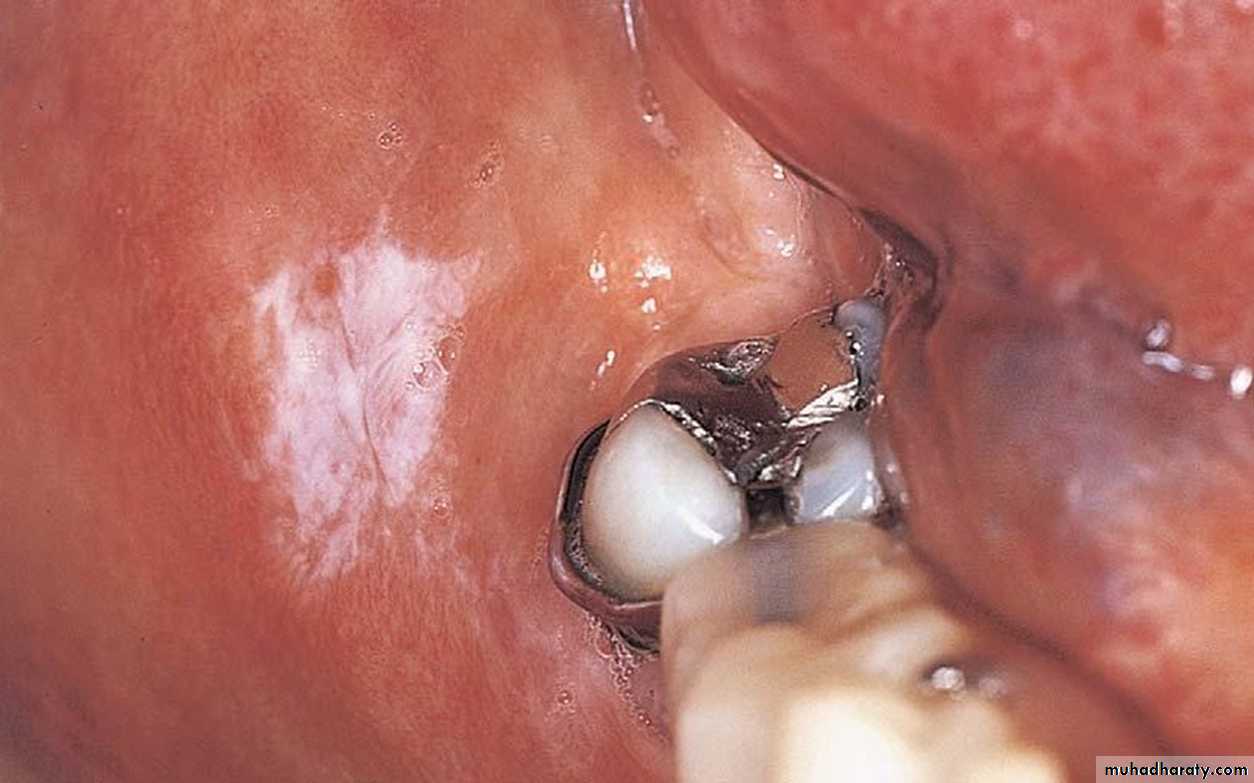 •Morsicatio Buccarum. White, ragged plaque involving the left buccal mucosa