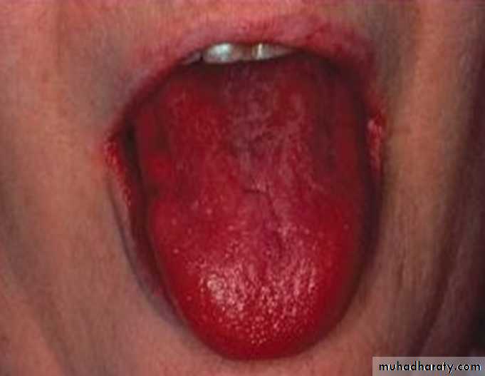 Acute atrophic candidiasis or antibiotic sore mouthD.D: Acute atrophic candidiasis. Antibiotic sore mouth. Atrophy associated with Iron