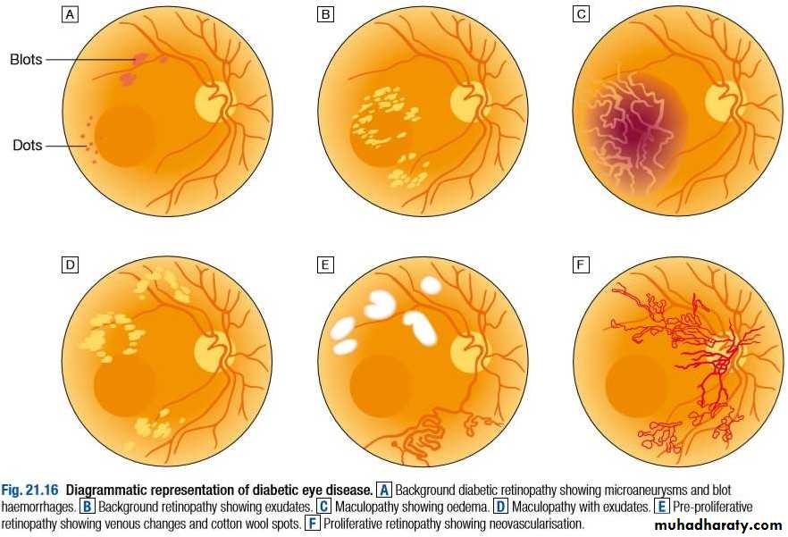 • Cystoid macular edemaincrease vascular permeability& deposition of hard exudates in central retina loss of vision• Proliferativestimulates new vessels to grow on the ant. Surface of the iris (rubeosis iridis)secondory glaucoma