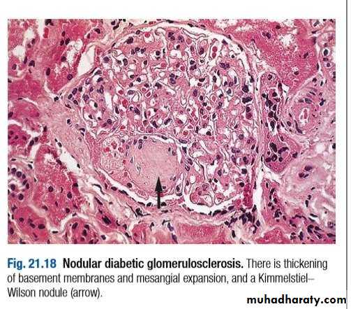• mesangial expansion is directly induced by hyperglycemia, perhaps via increased matrix production or glycosylation of matrix proteins.
