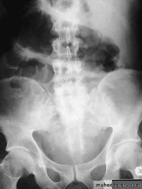 Imaging in volvulusIn caecal volvulus, radiography may reveal a gas-filled ileum andoccasionally a distended caecum. A barium enema may be usedto confirm the diagnosis, with an absence of barium in thecaecum and a bird beak deformity.In sigmoid volvulus, a plain radiograph shows massive colonicdistension. The classic appearance is of a dilated loop of bowel.