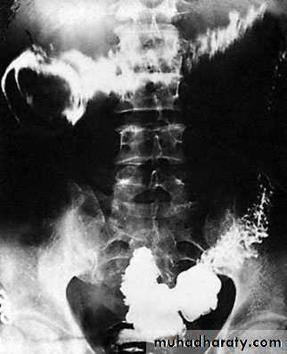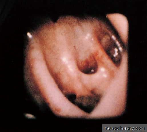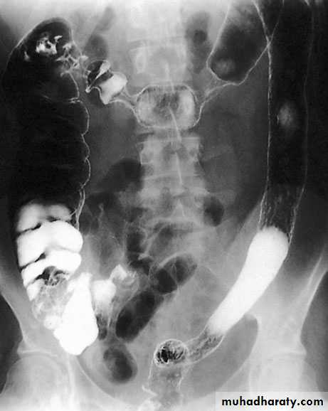Investigation-Barium enema is usually unhelpful and should be avoided, because it may mask the lesion at subsequent endoscopy. -colonoscopy may show the characteristic lesion in the right colon. The lesions are only a few millimetres in size and appear as reddish, raised areas at endoscopy. ‘Pill’ endoscopy is a relatively new technology that may detect small bowel lesions. -Selective superior and inferior mesenteric angiography shows the site and extent of the lesion - a radioactive test using technetium-99m(99mTc)-labelled red cells may confirm and localise the source ofhaemorrhage.