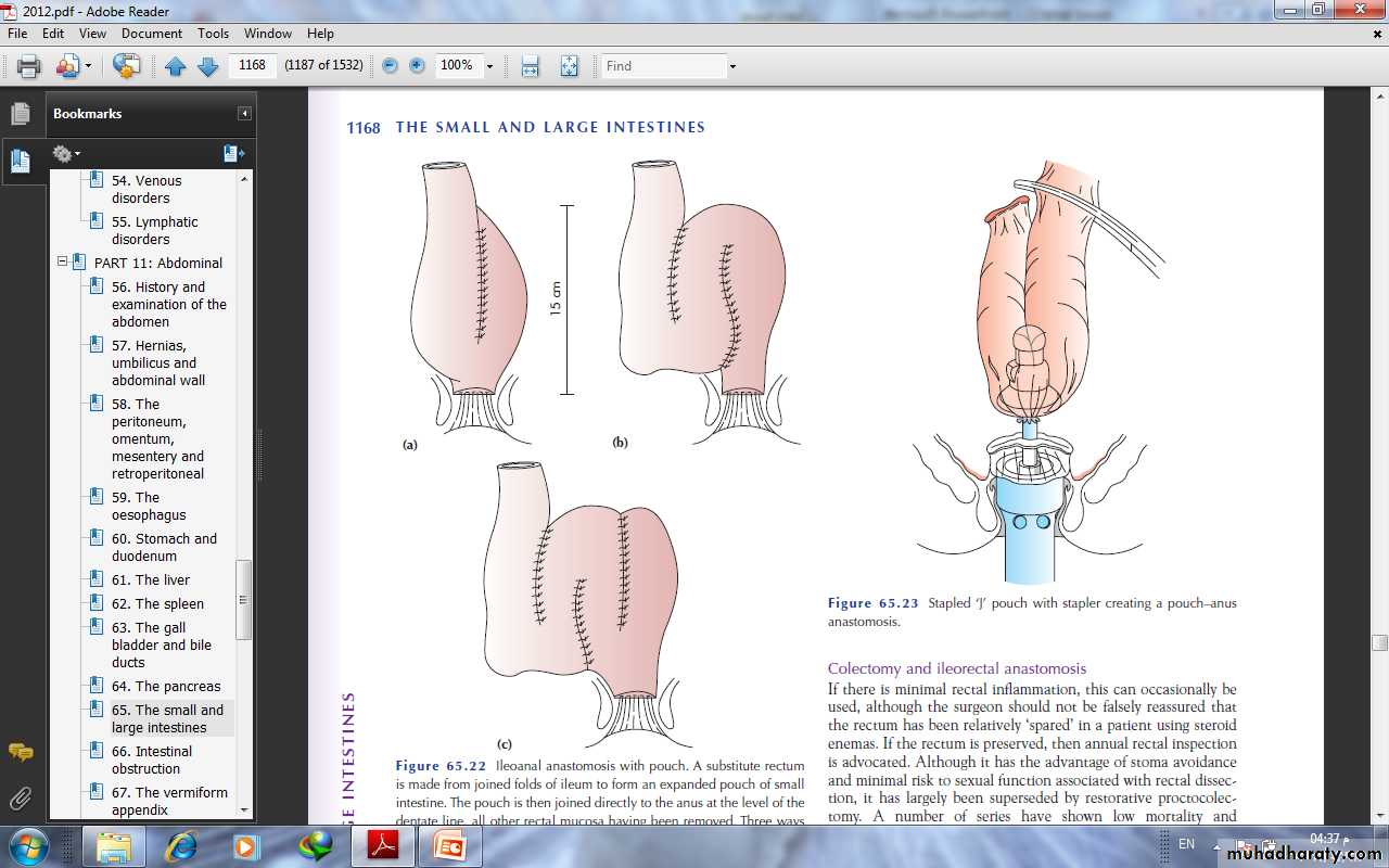 --Restorative proctocolectomy with an ileoanal pouch (Parks)In this operation, a pouch is made out of ileum as asubstitute for the rectum and sewn or stapled to the anal canal.This avoids a permanent stoma.