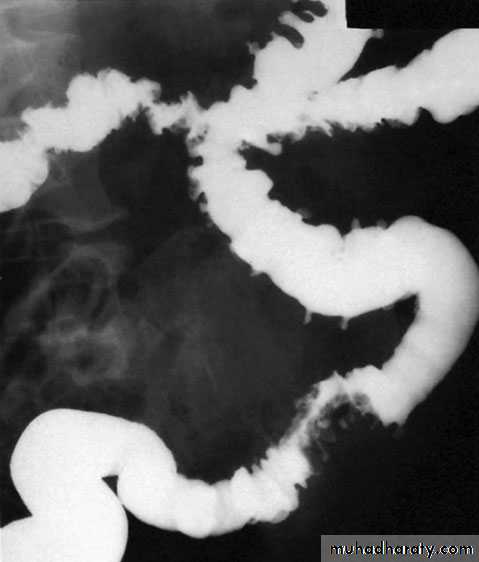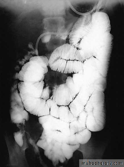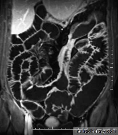 ImagingBarium enema will show similar features to those of colonoscopyin the colon. The best investigation of the small intestine is smallbowel enema . This will show up areas of delay anddilatation. The involved areas tend to be narrowed, irregular and,sometimes, when a length of terminal ileum is involved, theremay be the string sign of Kantor. Sinograms are useful in patientswith enterocutaneous fistulae. CT scans are used in patients withfistulae and those with intra-abdominal abscesses and complexinvolvement .Magnetic resonance imaging (MRI) has been shown to be usefulin assessing perianal disease.
