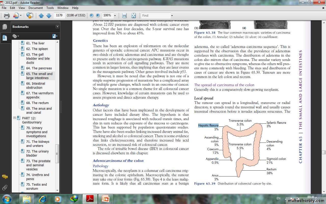 diverticular disease of Colon IntroductionThe prevalence of diverticular disease in the western world is60% over the age of 60 years. The condition is found in thesigmoid colon in 90% of cases, but the caecum can also beinvolved and, on occasion, the entire large bowel can be affected. The main morbidity of the disease is due to sepsis.AetiologyDiverticula of the colon are acquired herniations of colonicmucosa, protruding through the circular muscle at the pointswhere the blood vessels penetrate the colonic wall. They tend tooccur in rows between the strips of longitudinal muscle, sometimespartly covered by appendices epiploicae. The rectum withits complete muscle layers is not affected. It is thought to berelated to reduced fibre in the western diet. This results in lowstool bulk with resulting segmentation and hypertrophy of thecolonic wall musculature, thus causing increased intraluminalpressure. Diverticular disease is rare in Africans and Asians, whoeat a diet that is rich in natural fibre.
