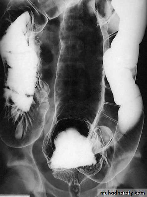 Barium enemaThe principal signs are :• loss of haustration, especially in the distal colon;• mucosal changes caused by granularity;• pseudopolyps;• in chronic cases, a narrow contracted colon.