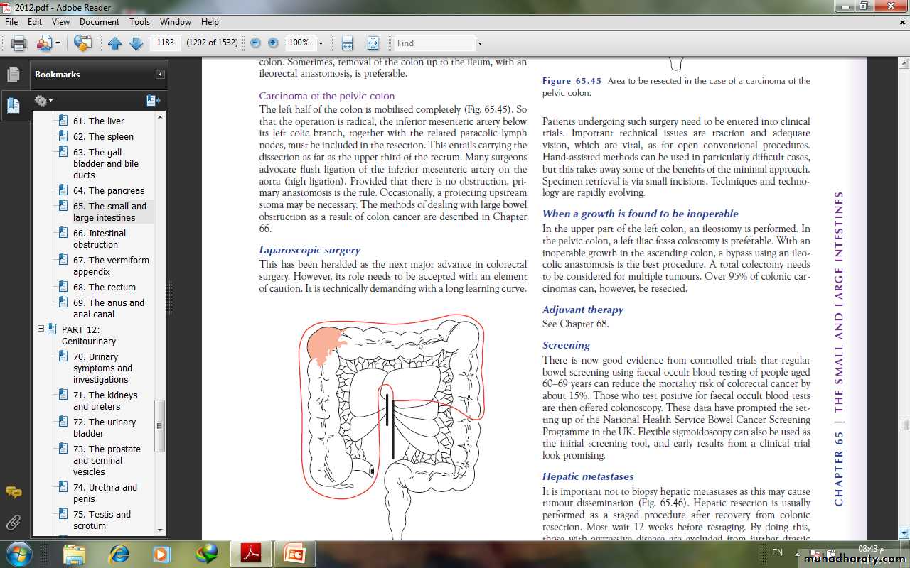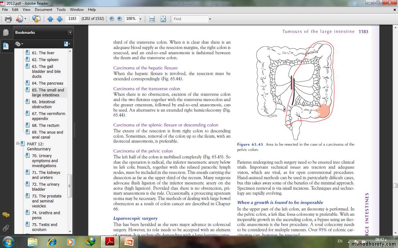 OperationsThe operations to be described are designed to remove the primary tumour and its draining locoregional lymph nodes, whichmay be involved by metastases. Lesser resections are indicated,however, should hepatic metastases render the condition incurable surgically. There is some evidence that early division ofmajor blood vessels supplying the involved colon (no-touch technique.