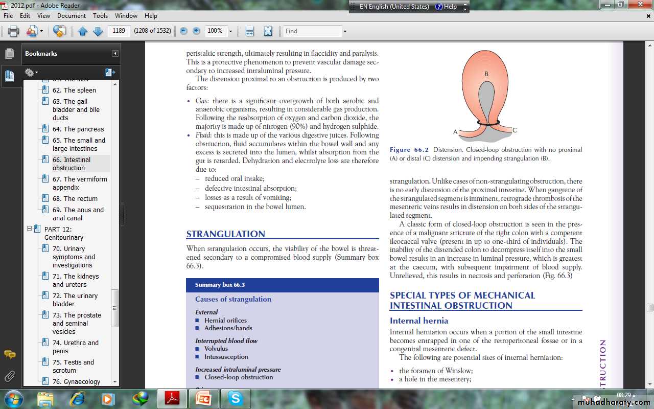 Chronic obstruction is usually seen in large bowel obstruction,with lower abdominal colic and absolute constipation followedby distension. Presentation will be further influenced by whether theobstruction is:• simple – in which the blood supply is intact;• strangulating/strangulated – in which there is direct interferenceto blood flow, usually by hernial rings or intraperitonealadhesions/bands.