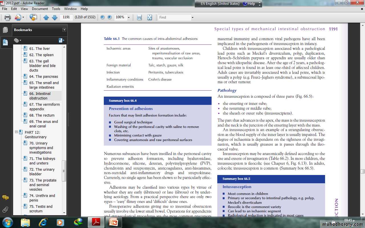 Postoperative adhesions giving rise to intestinal obstructionusually involve the lower small bowel. Operations for appendicitisand gynaecological procedures are the most common precursorsand are an indication for early intervention