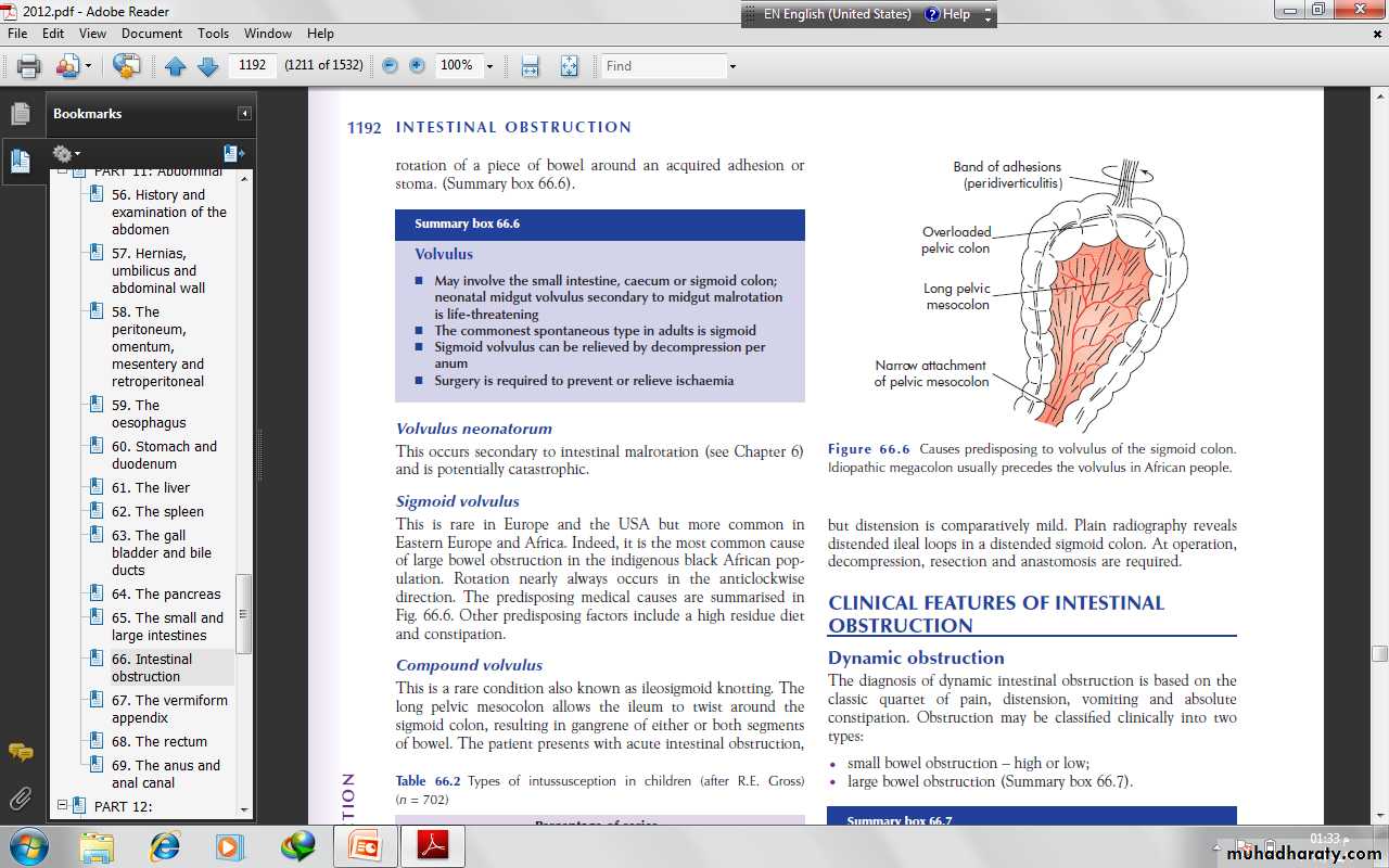 Clinical features of volvulus Sigmoid volvulusThe symptoms are of large bowel obstruction, which may initiallybe intermittent followed by the passage of large quantities offlatus and faeces.Abdominal distension is an early and progressive sign, which maybe associated with hiccough and retching; vomiting occurs late.Constipation is absolute.IMAGINGErect abdominal films are no longer routinely obtained and theradiological diagnosis is based on a supine abdominal film. An erect film may subsequently be requested when furtherdoubt exists.When distended with gas, the jejunum, ileum, caecum andremaining colon have a characteristic appearance in adults andolder children that allows them to be distinguished radiologically.