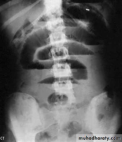 Abdominal distension becomes more marked and tympanitic.Pain is not a feature. In the absence of gastric aspiration, effortlessvomiting may occur. Radiologically, the abdomen shows gasfilledloops of intestine with multiple fluid levels.