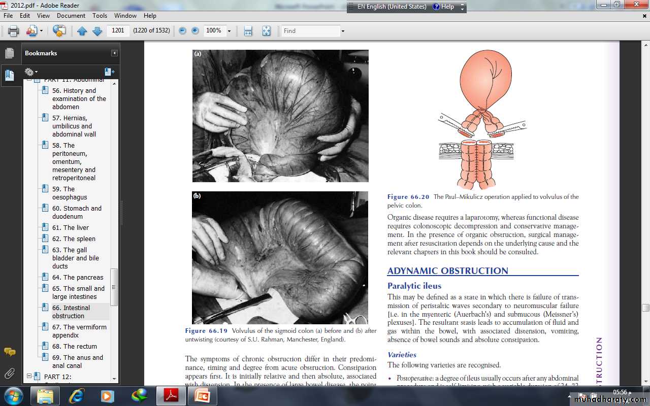 ADYNAMIC OBSTRUCTIONParalytic ileusThis may be defined as a state in which there is failure of transmission of peristaltic waves secondary to neuromuscular failure [i.e. in the myenteric (Auerbach’s) and submucous (Meissner’s) plexuses]. The resultant stasis leads to accumulation of fluid and gas within the bowel, with associated distension, vomiting, absence of bowel sounds and absolute constipation.