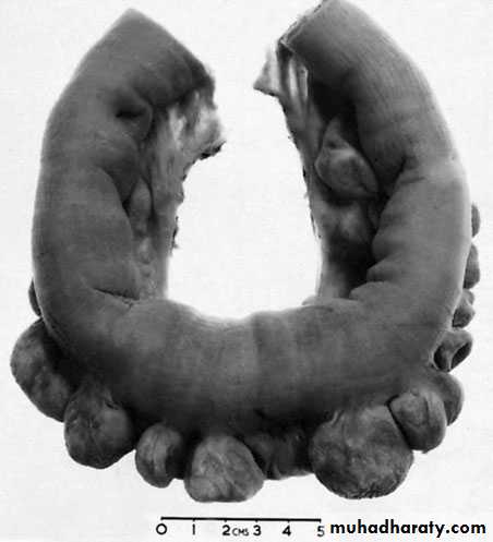 When the disease is chronic, inflammatory polyps(pseudopolyps) occure and may be numerous.In severe fulminant colitis, a section of the colon, usuallythe transverse colon, may become acutely dilated, with the risk ofperforation (‘toxic megacolon’). On microscopic investigation,there is an increase in inflammatory cells in the lamina propria,the walls of crypts are infiltrated by inflammatory cells and thereare crypt abscesses. There is depletion of goblet cell mucin. Withtime, these changes become severe, and precancerous changescan develop (= severe dysplasia or carcinoma in situ).