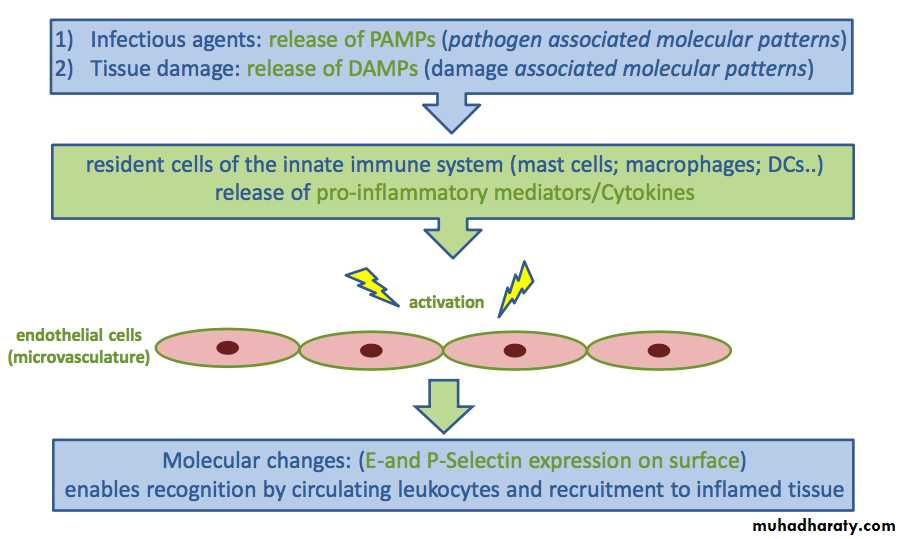 In innate immunity, this process is largely initiated by pathogen-associated molecular patterns (PAMPs), released by invading microorganisms, and damage-associated molecular patterns (DAMPs), derived from damaged and/or dead-cells, or in response to tissue and/or cellular stress