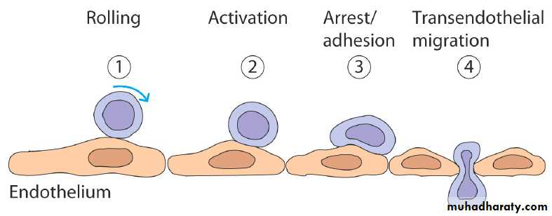 Leukocytes are slowed as they pass through a venule and roll on the surface of the endothelium. This is mediated by selectins interaction with carbohydrates on glycoproteins.The slowed leukocytes have an opportunity to respond to signaling molecules at the endothelial surface like, chemokines.