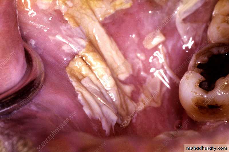 Severe erosive OLPThick layers of yellowish fibrin covers extensive ulcers