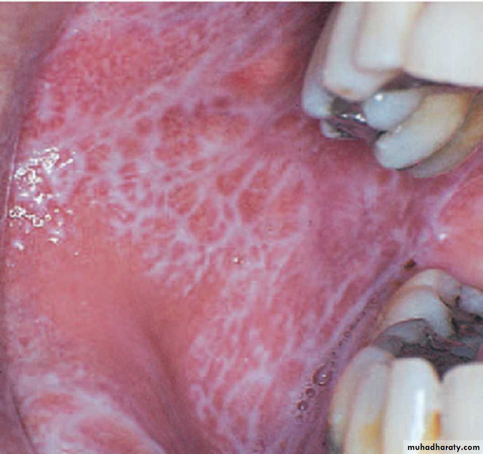 Lacy network of white striae on the buccal mucosa,the lesions are usually symmetrical