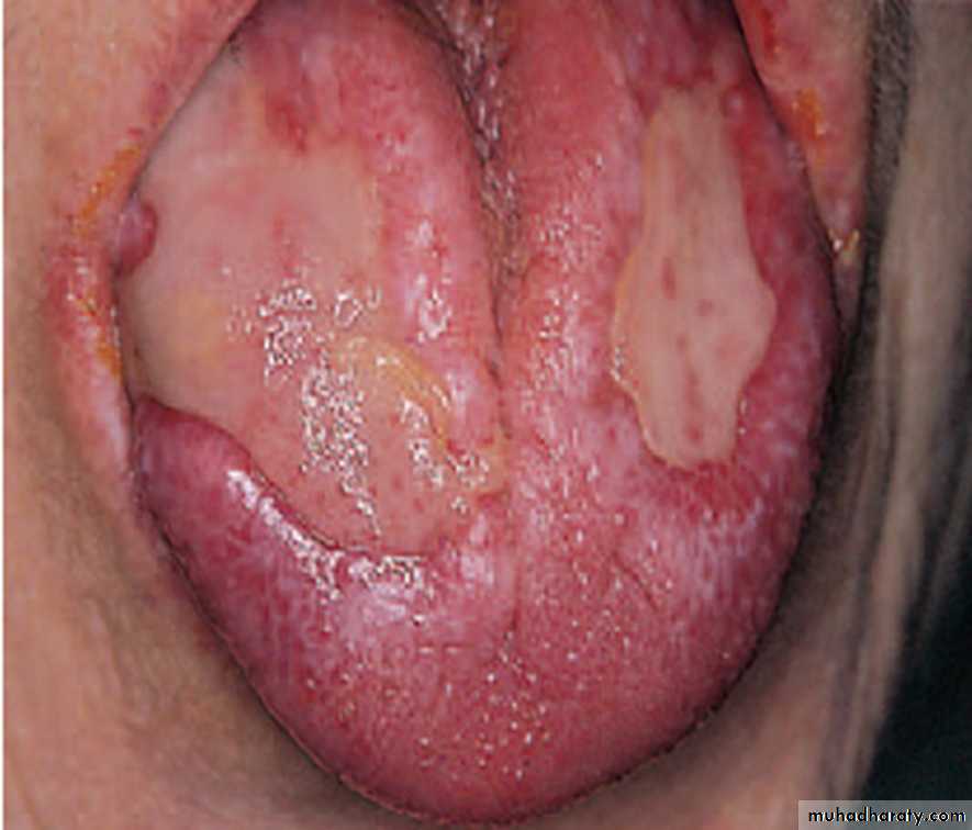 Erosive OLP: Two extensive areas of shallow ulcerations on the dorsum of the tonguecovered with fibrin layers