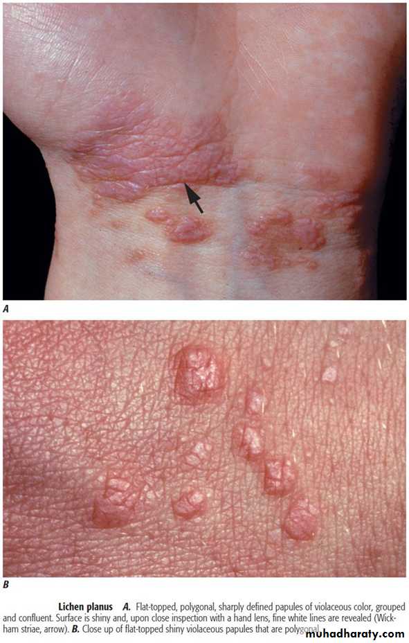 Purplish papules and Wickham's striaeLichen planus-Skin lesions and nail lesions
