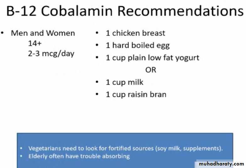 -Its deficiency lead to pernicious anemia.-Its liver store depleted in 3-6years.